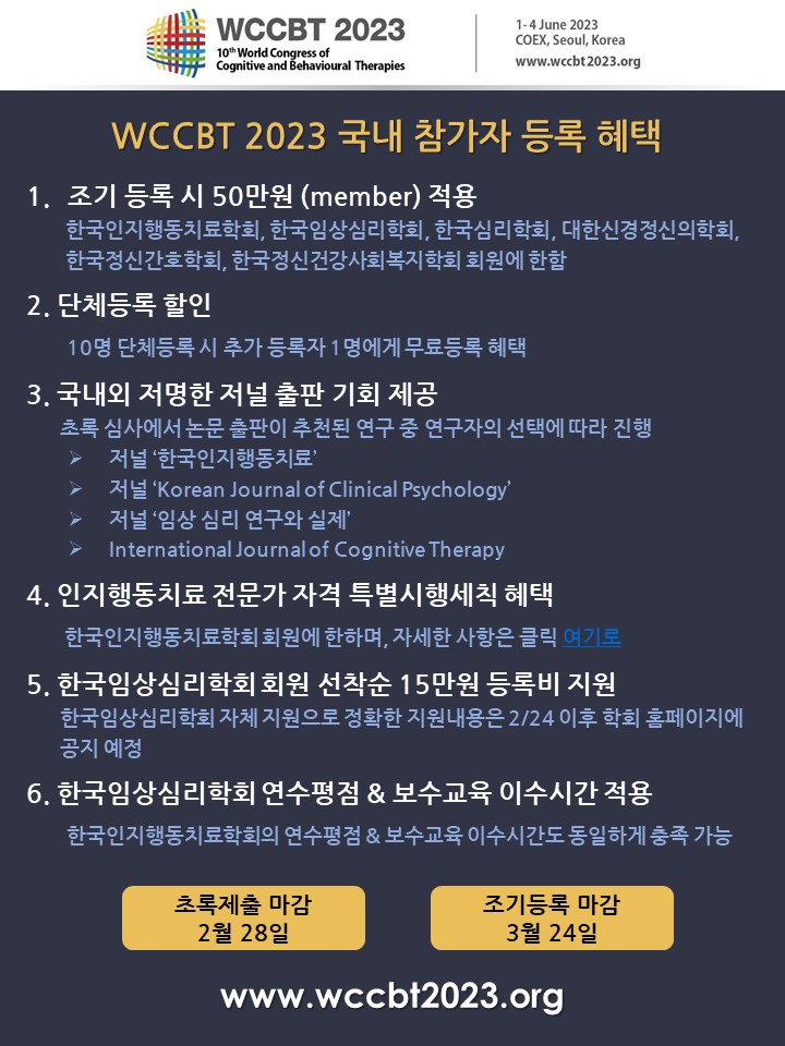 제10차 세계인지행동치료 학술대회(WCCBT2023) 참가자 등록혜택 안내