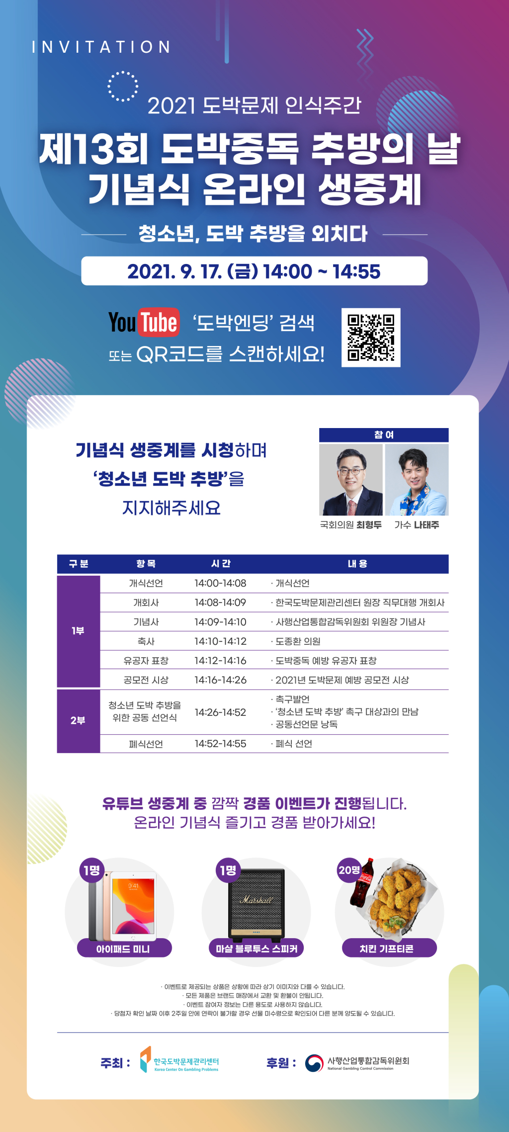제13회 도박중독 추방의 날 기념식을 온라인으로 생중계할 예정입니다.