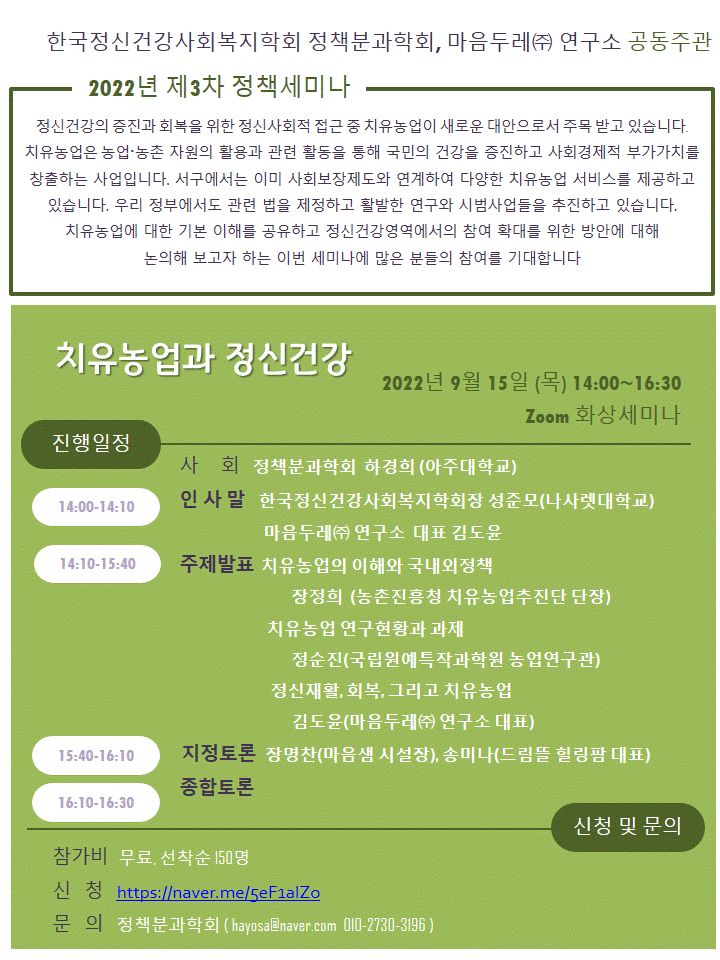 한국정신건강사회복지학회 정책분과학회, 마음두레㈜ 연구소 공동주관