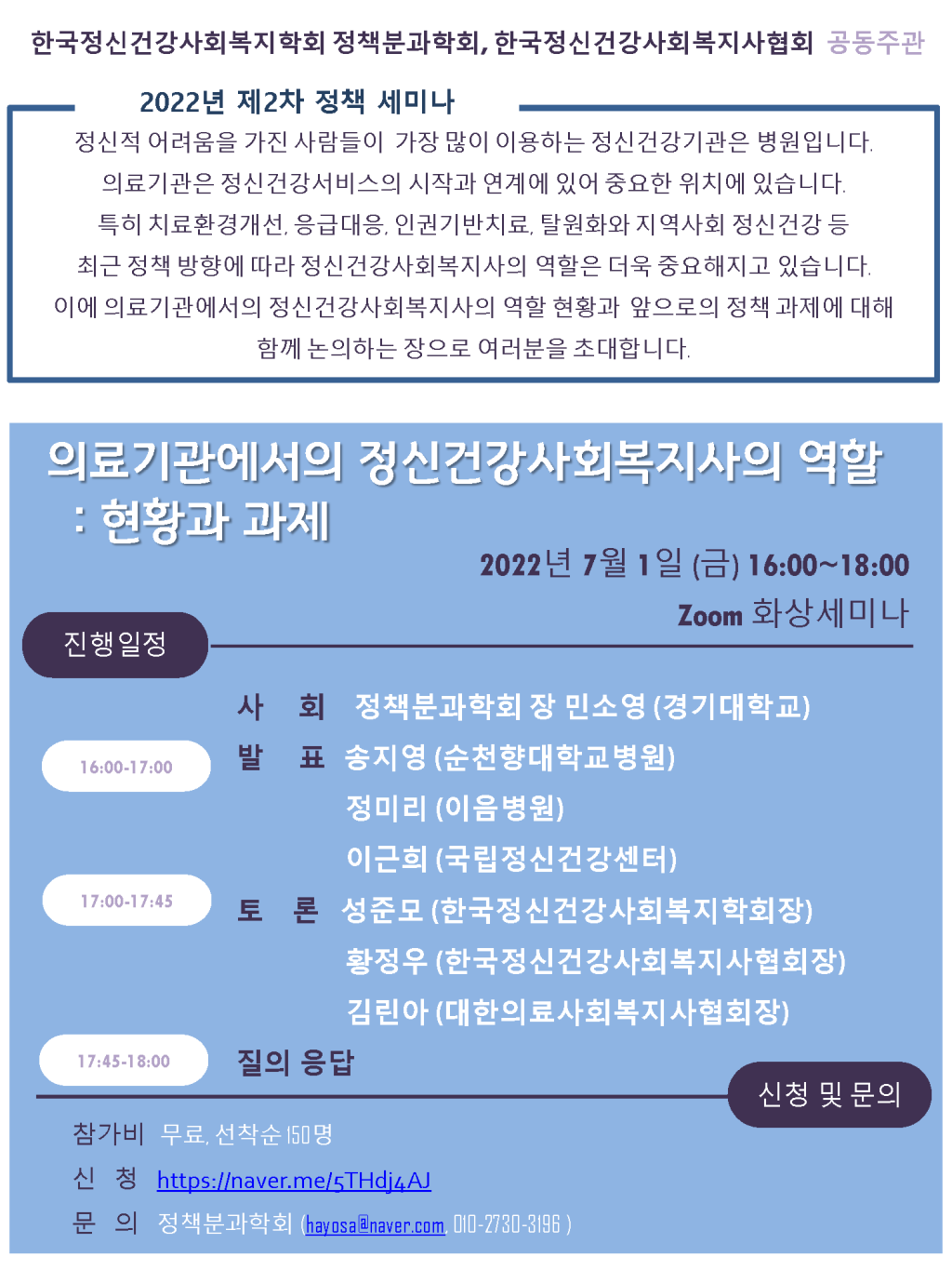 올해 두 번째로 열리는 7월 세미나는 ‘의료기관에서의 정신건강사회복지사의 역할’이라는 주제로 한국정신건강사회복지사협회와 공동주관으로 진행됩니다.