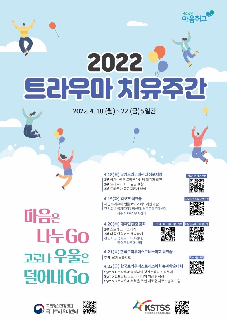 일시: 2022년 4월 21일(목)-22일(금) 공동주최: 국가트라우마센터, 한국트라우마스트레스학회(KSTSS) 주관: 한국트라우마스트레스학회(KSTSS) 방법: 유튜브 실시간 생중계 및 사전등록자에 한하여 URL과 e-자료집을 이메일로 배포 사전등록기간: 2022년 3월 24일(목) ~ 4월12일(화) 사전등록 및 프로그램 안내: https://forms.gle/w8sQ1jRMZgNKJakGA |