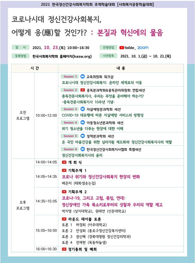 2021 한국정신건강사회복지학회 추계학술대회를 사회복지 공동학술대회로 개최하오니,