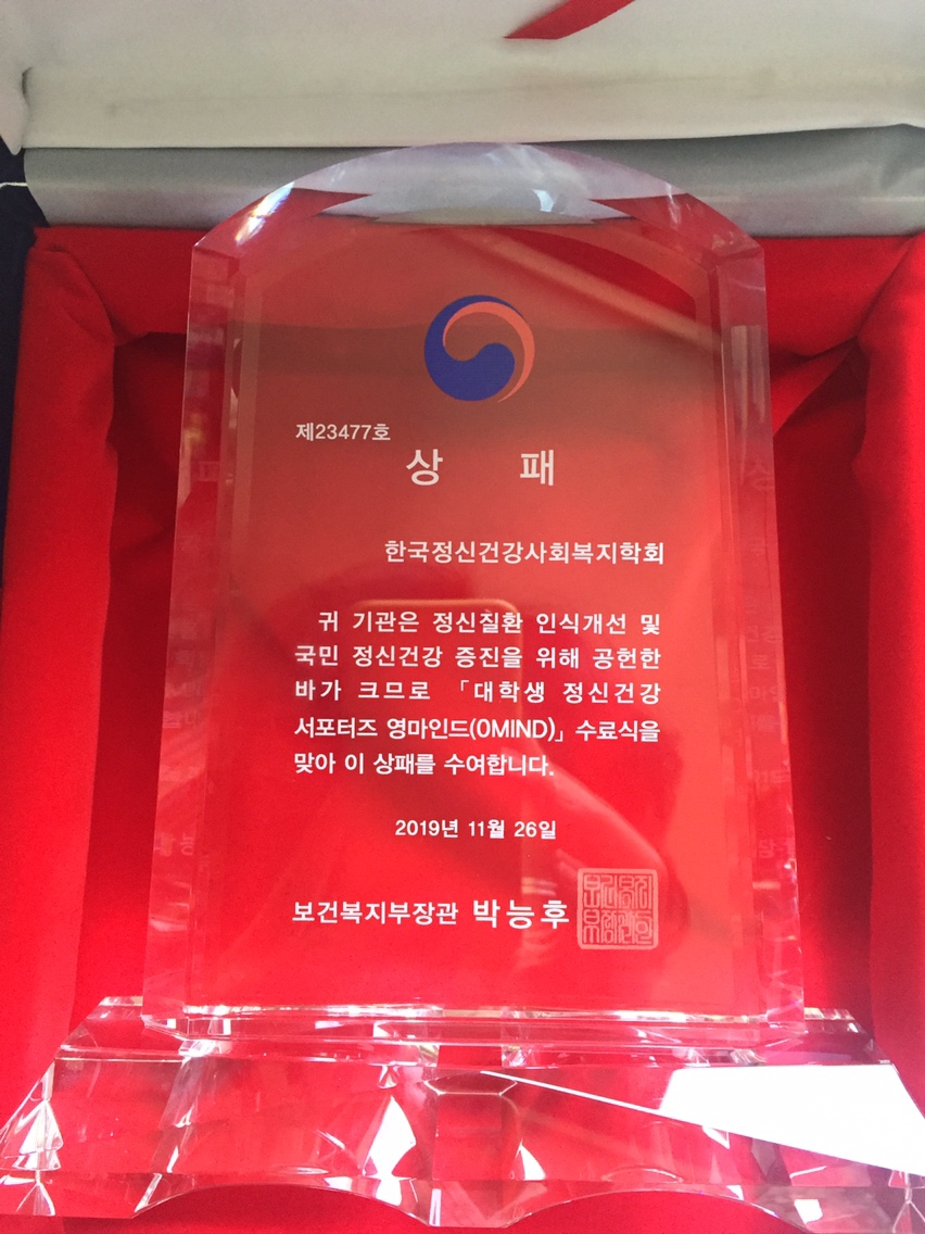 우리 학회는 이 사업에 후원한 공로로 보건복지부장관상을 받았습니다.