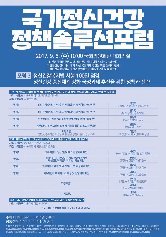 저희 학회도 공동주관으로 참여하고 있어 국가정신건강정책 솔루션 3차 포럼의 내용 및 일정을 아래와 같이 안내드리고자 합니다. 학회원님들의 많은 관심과 참여를 부탁드립니다.