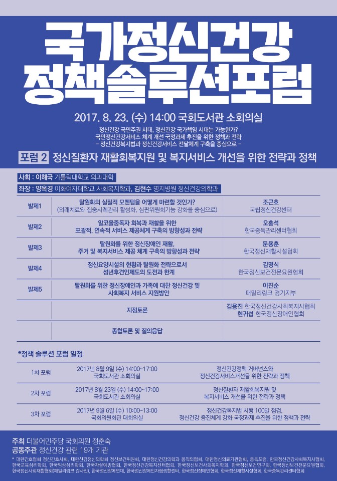 저희 학회도 공동주관으로 참여하고 있어 국가정신건강정책 솔루션 2차 포럼의 내용 및 일정을 아래와 같이 안내드리고자 합니다. 학회원님들의 많은 관심과 참여를 부탁드립니다.