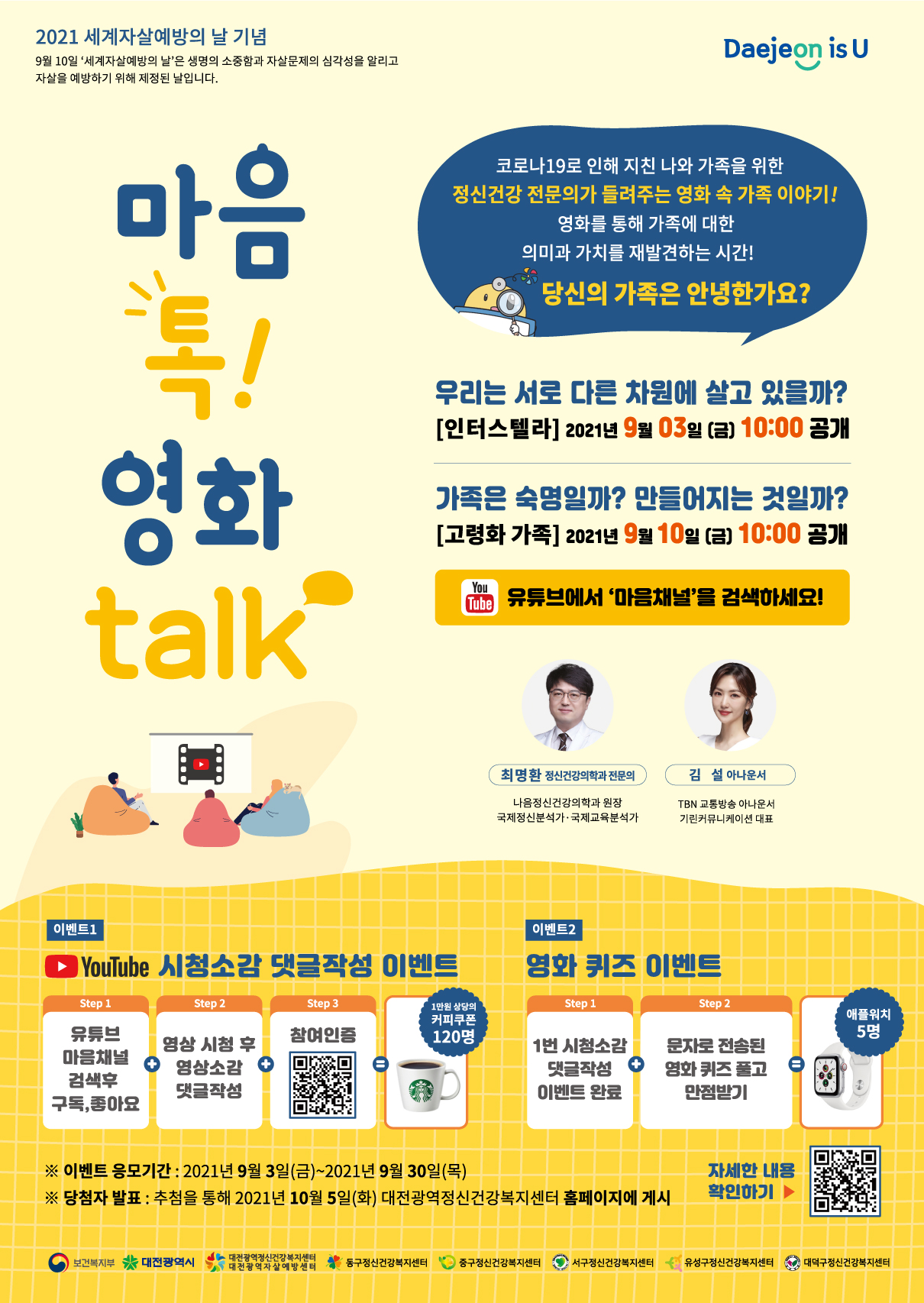대전광역자살예방센터에서는 세계자살예방의 날(9.10)을 맞이하여 자살예방의 날 기념행사 「마음 톡! 영화 talk!」을 실시하오니 많은 관심과 참여를 부탁드립니다.