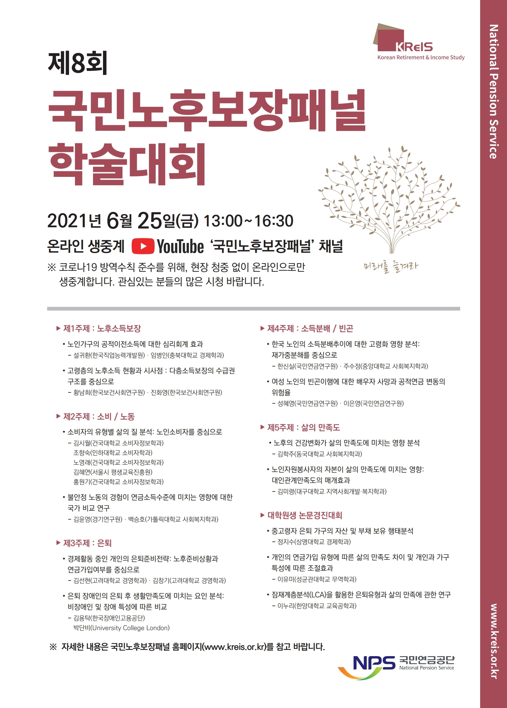 오는 6월 25일(금) 유튜브 온라인 생중계를 통해 제8회 국민노후보장패널 학술대회를 개최합니다.