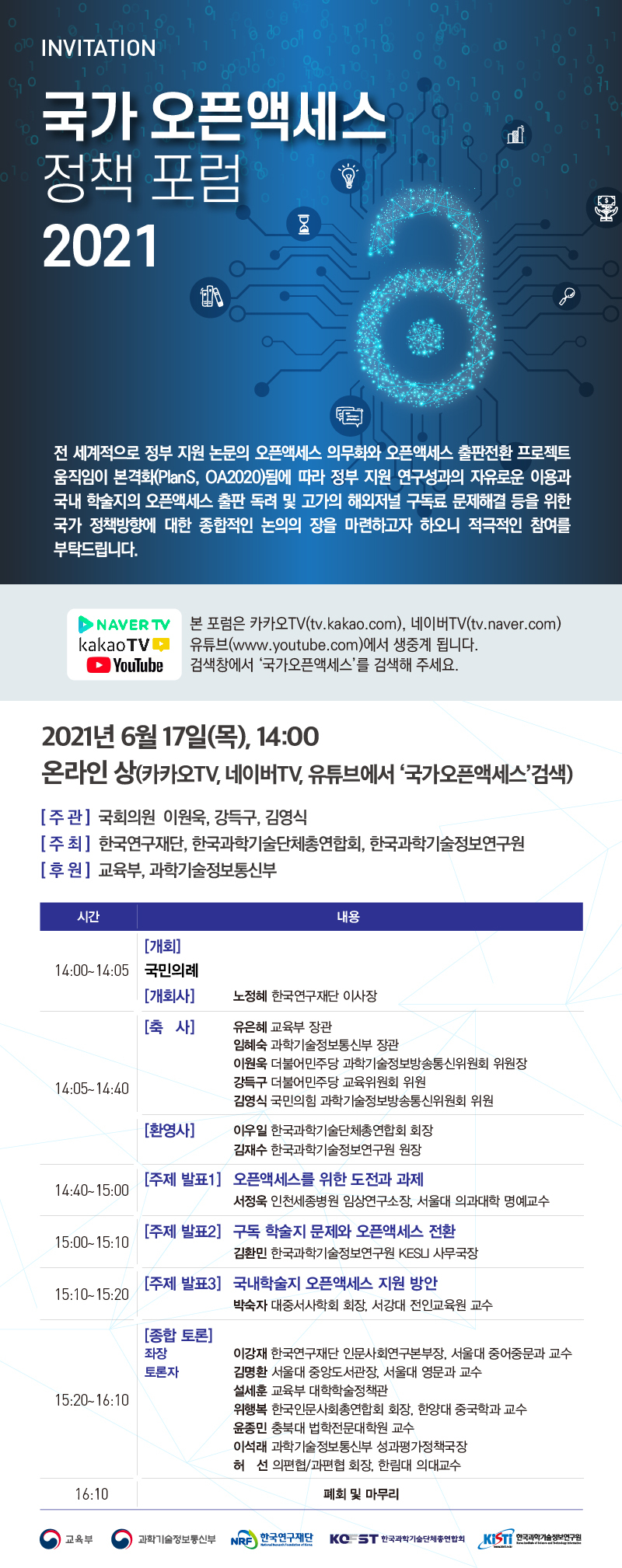 한국연구재단에서는 한국과학기술단체총연합회, 한국과학기술정보연구원과 공동으로 『국가 오픈액세스 정책 포럼 2021』을 개최하고자 합니다.