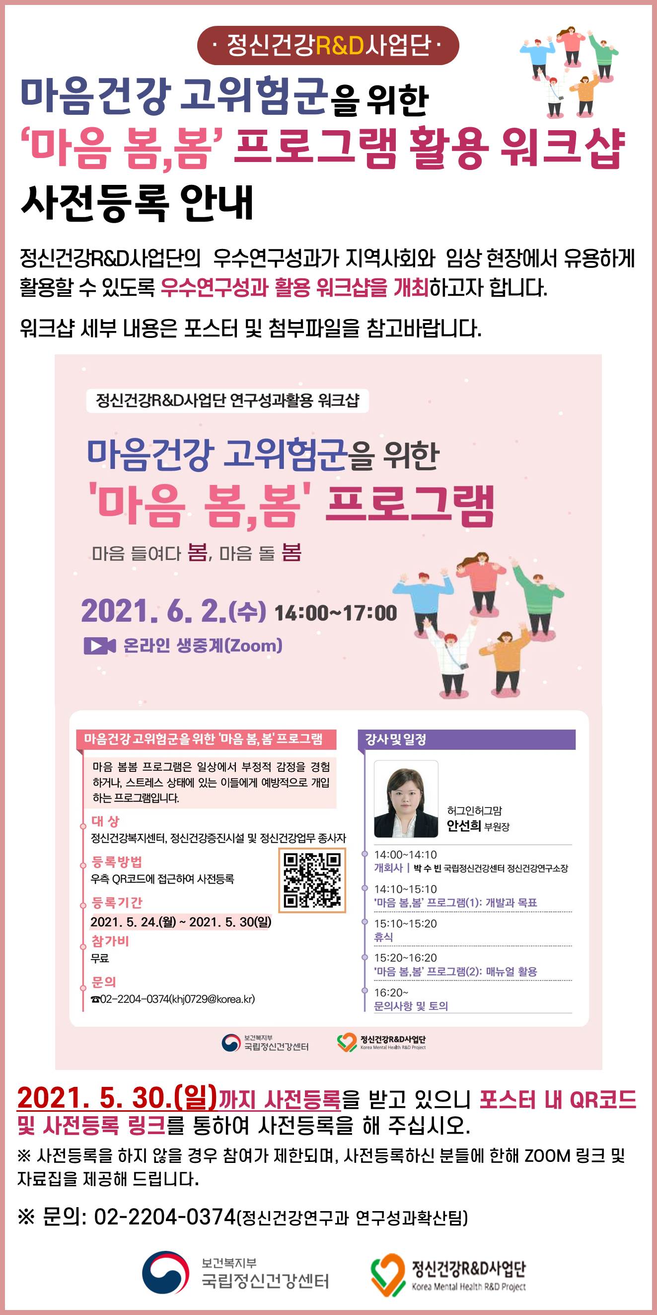 정신건강R&D사업단 우수연구성과 활용 워크샵(마음봄봄 프로그램) 안내