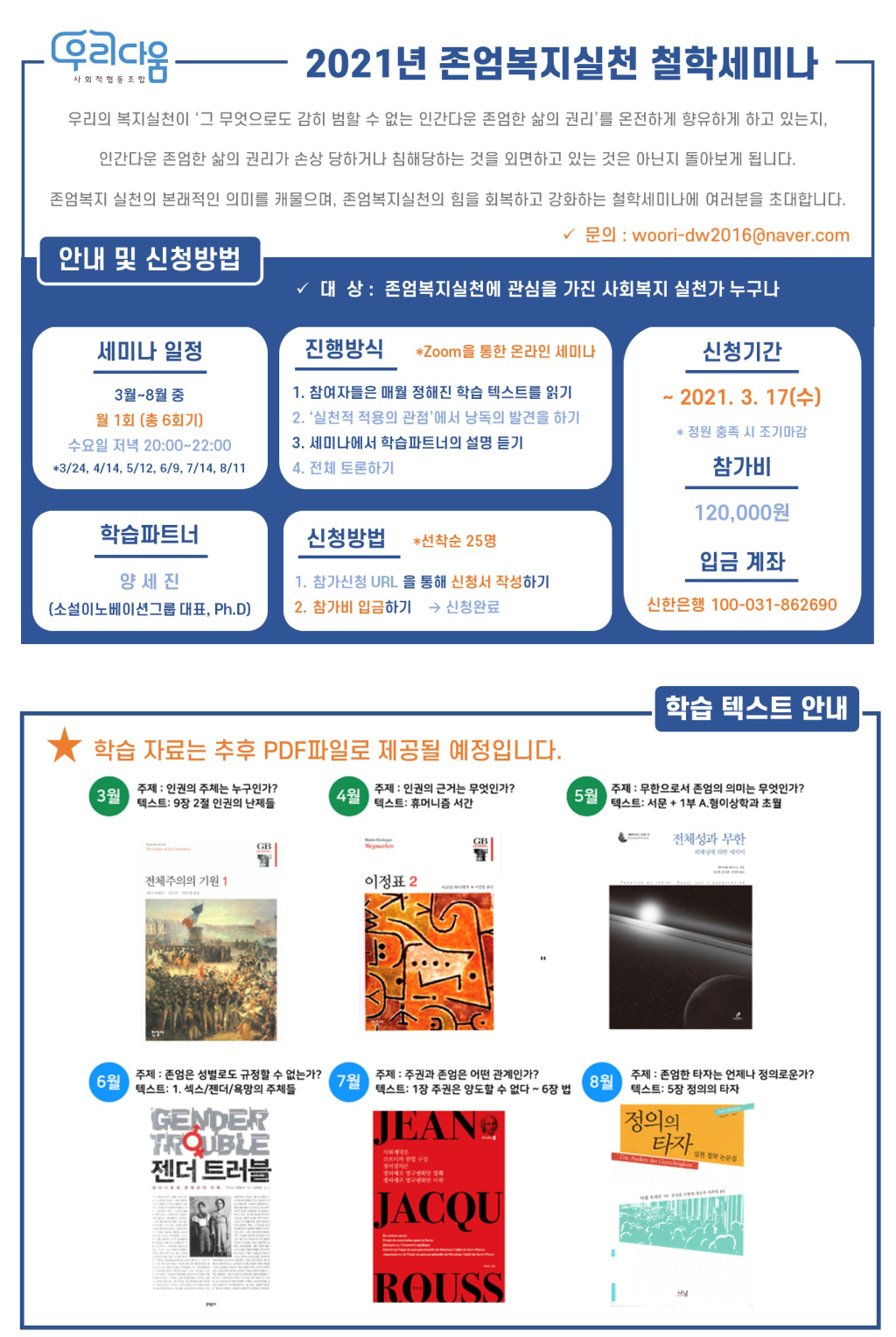 우리다움에서는 2021년에 사회복지실천가들과 '존엄복지실천 철학세미나'를 함께 하고자 합니다.