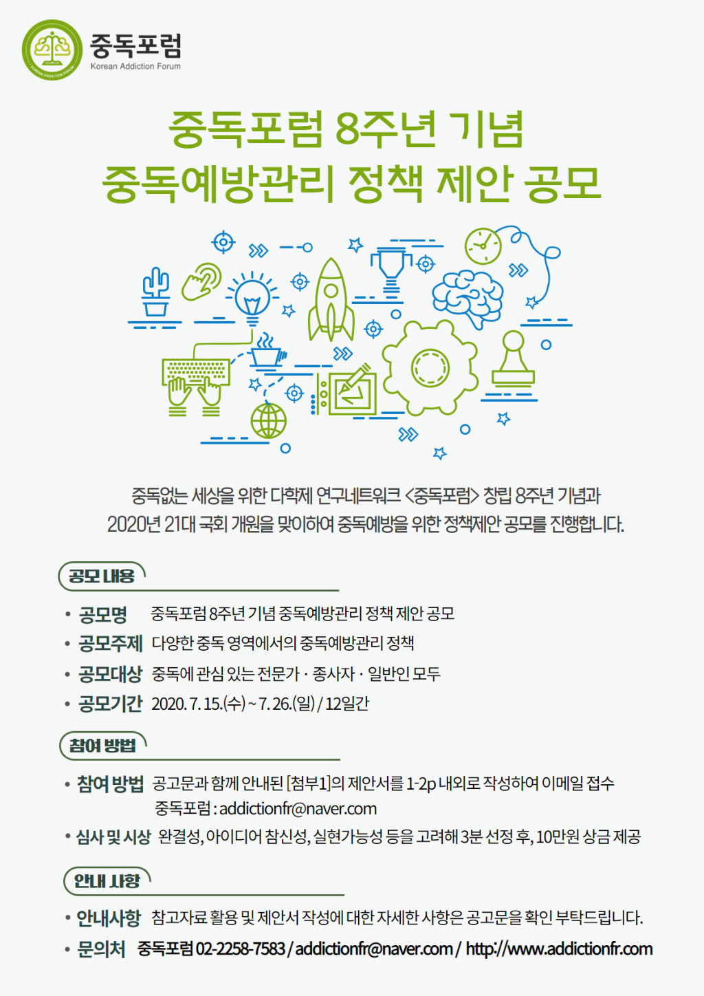 2020년 21대 국회 개원과 중독포럼 창립 8주년을 맞이하여, 중독예방을 위한 정책제안 공모전을 개최하고자 합니다.