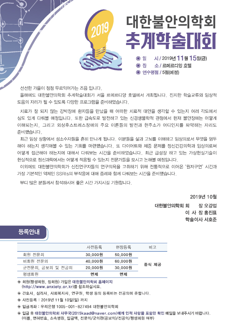 [대한불안의학회] 2019 추계학술대회 안내 (사전등록 11월 10일 까지)