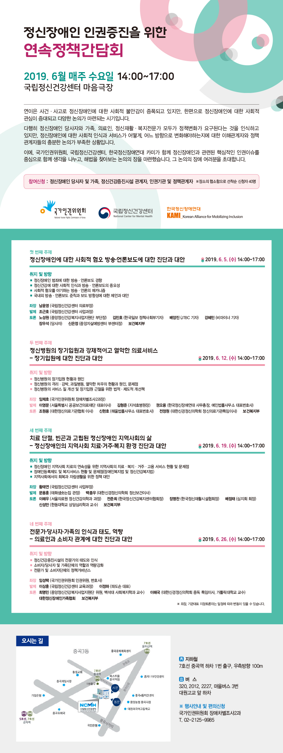 연이은 사건·사고로 정신장애인에 대한 사회적 불안감이 증폭되고 있지만, 한편으로 정신장애인에 대한 사회적 관심이 증대되고 다양한 논의가 마련되는 시기입니다. 다행히 정신장애인 당사자와 가족, 의료인 정신재활·복지전문가 모두가 정책변화가 요구된다는 것을 인식하고 있지만, 정신장애인에 대한 사회적 인식과 서비스가 어떻게, 어느 방향으로 변화해야하는지에 대한 이해관계자와 정책 관계자들의 충분한 논의가 부족한 상황입니다. 이에 국가인권위원회, 국립정신건강센터, 한국정신장애연대 카미가 함께 정신장애인과 관련된 핵심적인 인권이슈를 중심으로 함께 생각을 나누고, 해법을 찾아보는 논의의 장을 마련했습니다. 그 논의의 장에 여러분을 초대합니다.