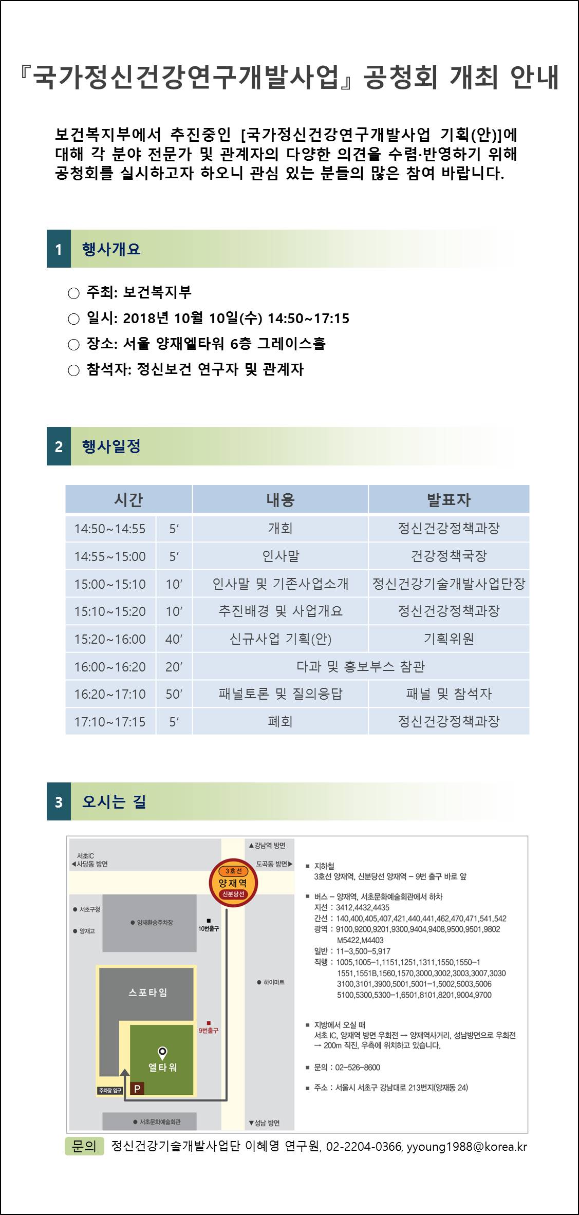 이에 귀 기관에 홍보를 요청드리오니, 붙임의 [국가정신건강연구개발사업 공청회 안내문]을 홈페이지 게시 및 한국정신보건사회복지학회 회원분들께 메일 발송을