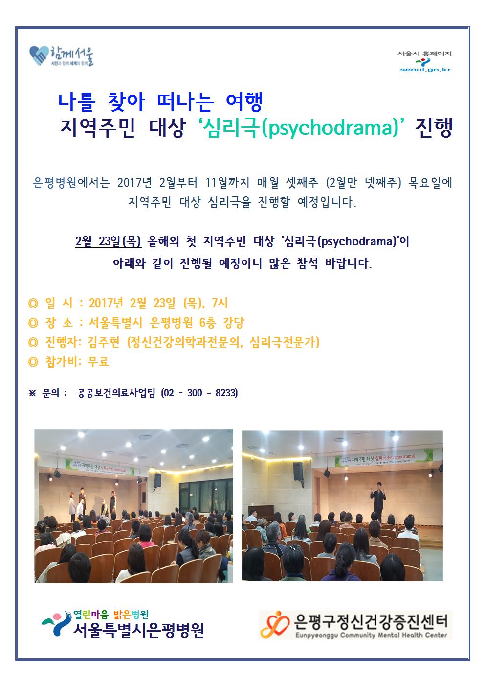 은평병원은 2월부터 11월까지 매월 지역주민들을 대상으로 심리극(psychodrama)을 진행하고 있습니다. 2017년도 2월 23일 (목), 올해의 첫 심리극이 아래와 같이 진행 예정이오니 많은 참석 부탁드립니다.