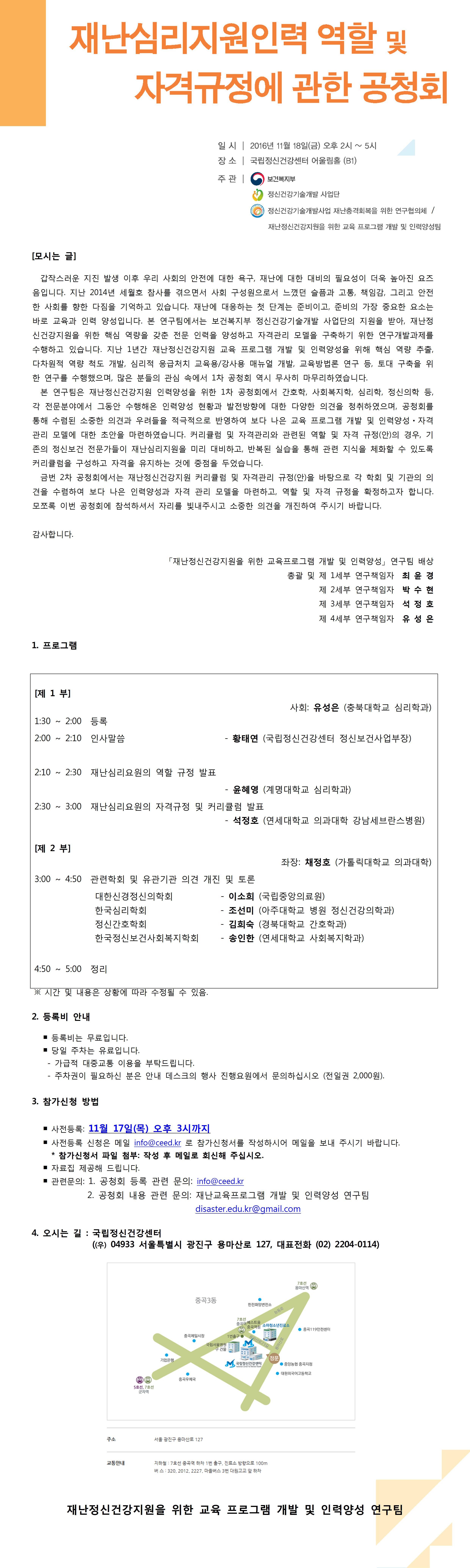 - 행사명: 재난심리지원인력 역할 및 자격규정에 관한 공청회