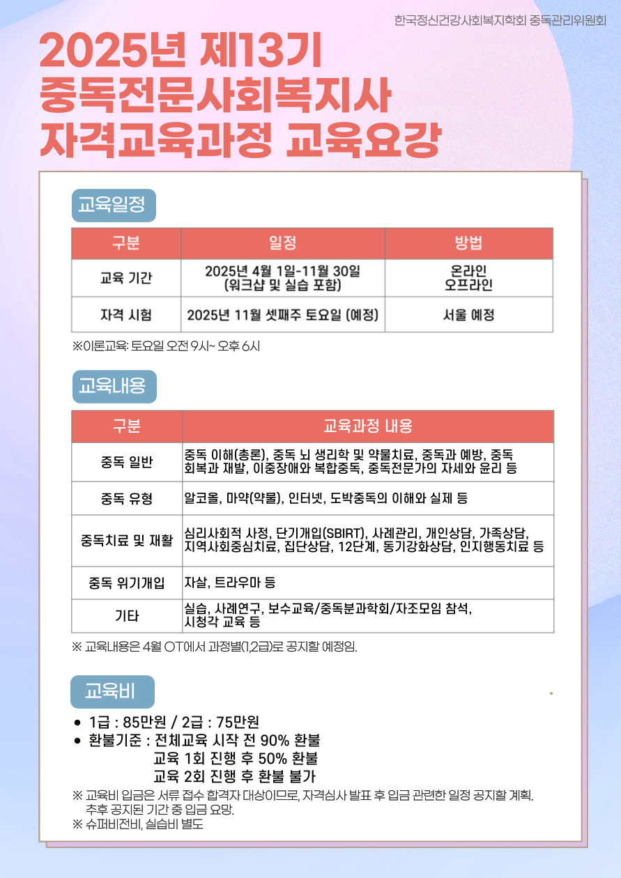 2025년 제13기 중독전문사회복지사 자격교육과정을 진행합니다.