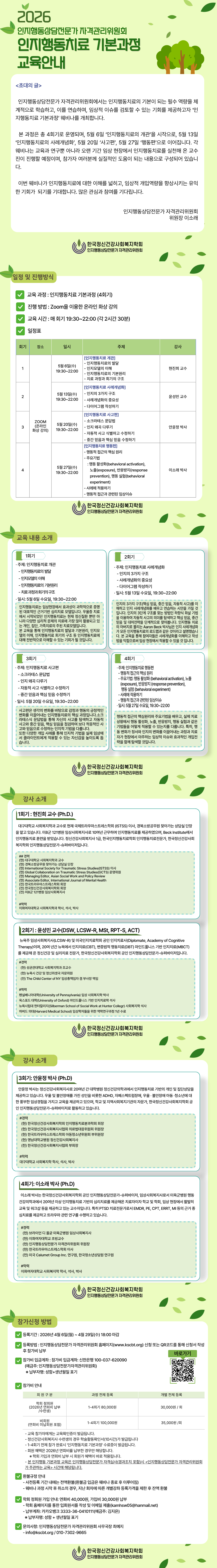 인지행동치료 기본과정 웨비나를 운영하오니 학 회원 및 여러실천현장에서 일하고 계신 분들의 많은 관심과 참여를 부탁드립니다.