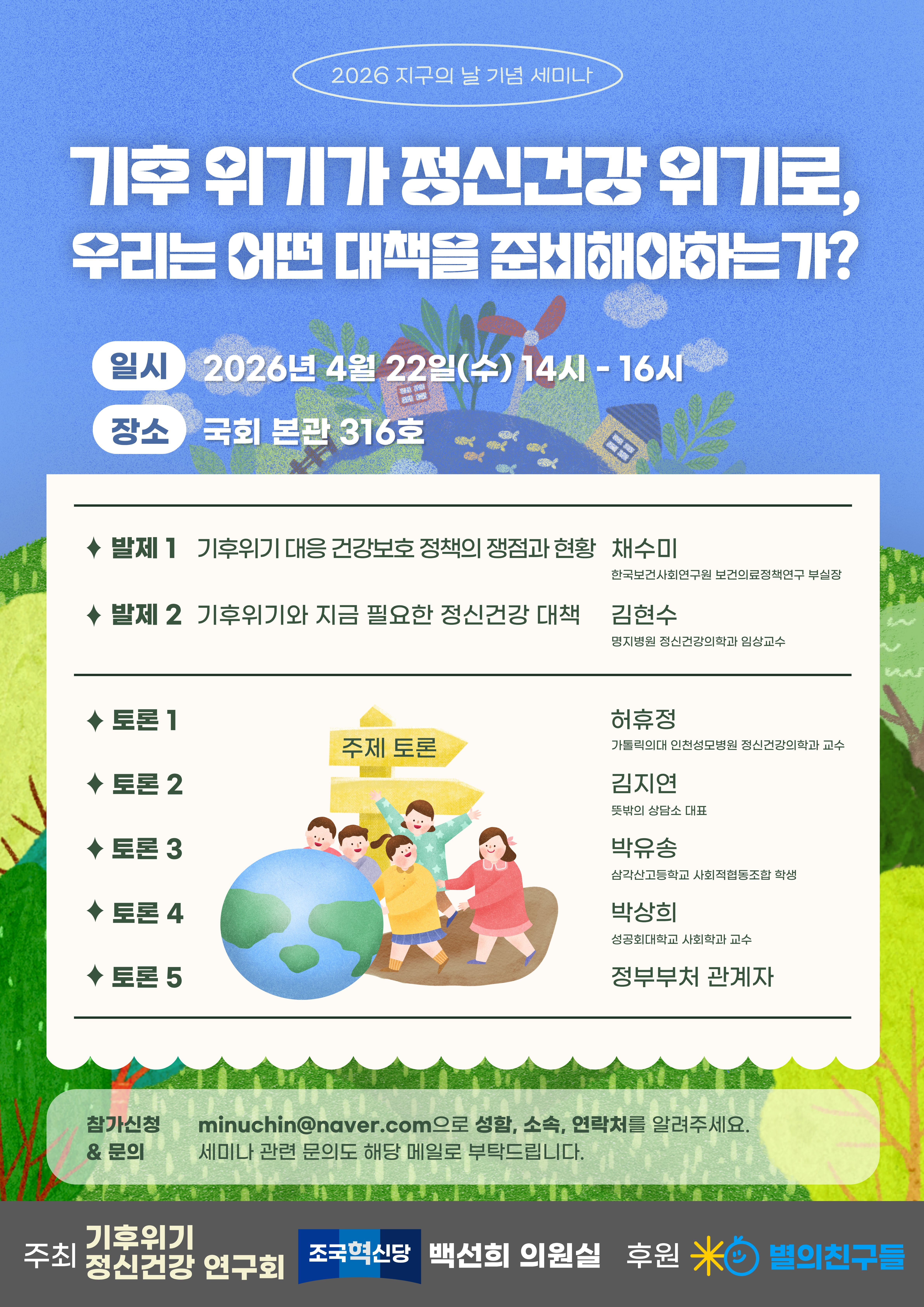 기후위기가 개인의 정신건강과 사회적 안녕에 미치는 영향을 살펴보고, 이에 대한 정책적·실천적 대응 방안을 논의하는 세미나를 개최합니다. 관심 있는 분들의 많은 참여를 바랍니다.