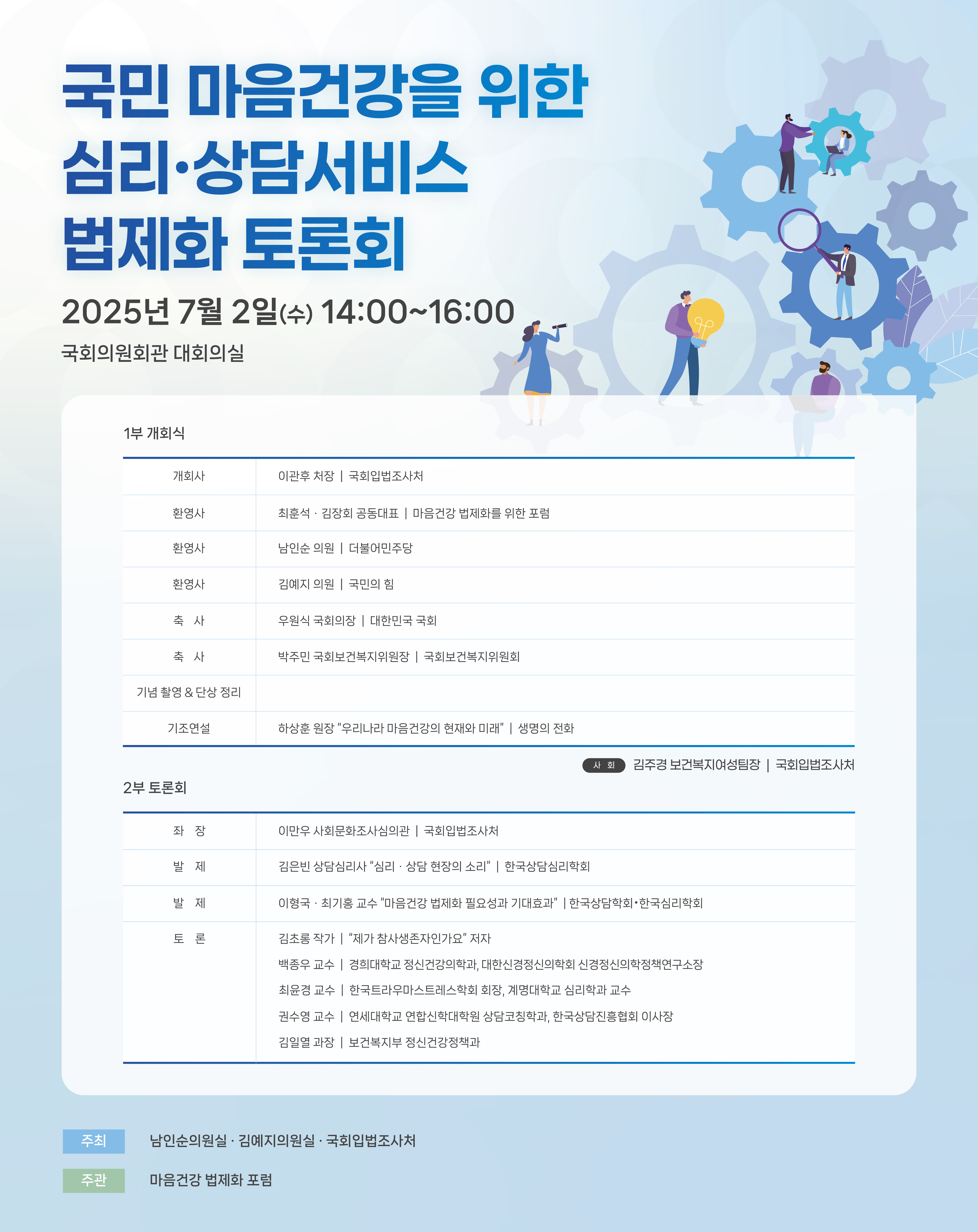조국혁신당의 백선희 국회의원과 함께 "전 국민 정신건강 증진과 자살률 감소를 위한 정신건강 전문인력 개선 방안"에 관한 토론회를 개최합니다.